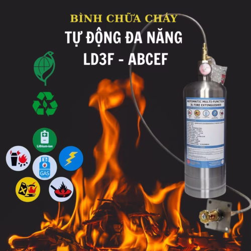 LIDA LD3F là bình chữa cháy tự động đa năng thế hệ mới, ứng dụng công nghệ sinh học tiên tiến từ Đài Loan. Sản phẩm được thiết kế để tự động kích hoạt và dập tắt mọi loại đám cháy, đặc biệt là cháy pin lithium (xe điện), cháy dầu ăn và cháy điện hở. Đây là giải pháp an toàn tuyệt đối cho con người, vật nuôi và môi trường.
